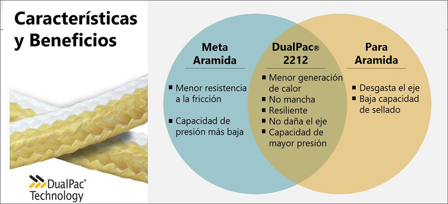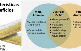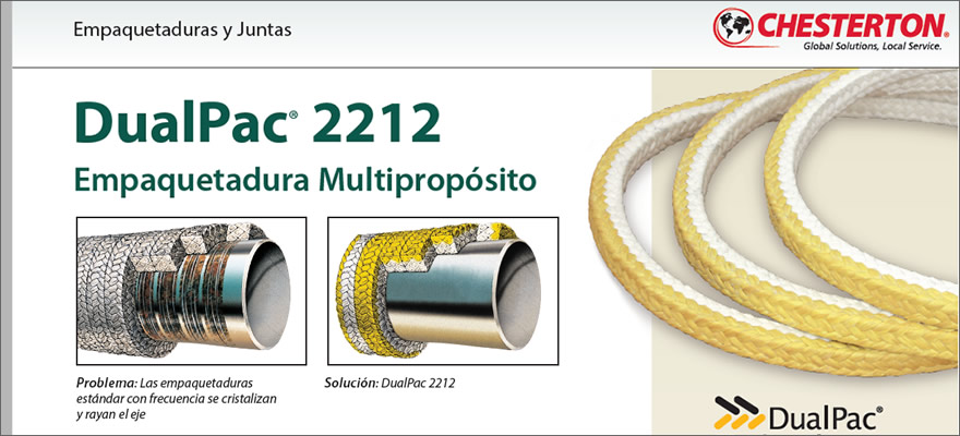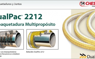 DualPac 2212: DualPac 2212: Empaquetadura termorresistente para Alta Presión, que no mancha y que requiere ajustes mínimos del prensaestopas, con rendimiento superior de Sellado. Chesterton DualPac 2212, combina un material resistente a las quemaduras del lado del eje de la empaquetadura, con una fibra externa altamente resistente