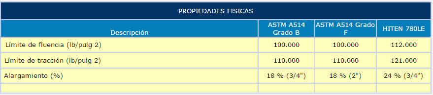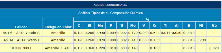 - Aceros Estructurales ASTM, A514 Y HITEN 780 para piezas estructurales de grandes equipos.