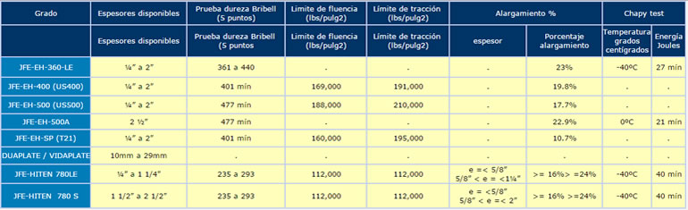 Planchas de acero estructural de alta resistencia Hiten 780 LE (similares a norma ASTM A-514) con una resistencia a la fluencia de 100,000 PSI y una dureza entre 240 y 290 BHN.